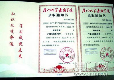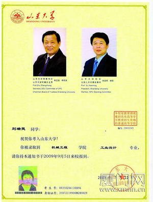 厦门三中的毕业生刘瑞灵没想到:山东大学寄给他的录取通知书上,不仅印着自己的照片,连大学校长和书记的照片也印在同一页上。