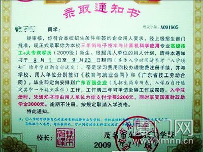 最“雷”的通知书,要求学生在入学时就签订毕业后的劳动就业合同,而雇用该学生的用人单位则帮忙缴纳部分学费。根据学生提供的线索,记者看到了一份“茂名市东南技工学校”的录取通知书。通知书称,该学生已被录取为“高级技工+大专双学历”新生,要求“带足学习费用”办理注册并要签订《教育与就业合同》。