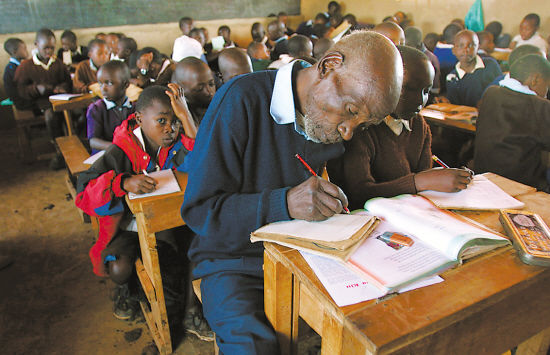 8月14日,据肯尼亚当地媒体报道,曾作为全球年岁最高的小学生被收入吉尼斯世界纪录的肯尼亚老人基马尼·马鲁格去世,享年90岁。2004年,肯尼亚开始实行义务教育,当时84岁的马鲁格闻讯入学,成为世界上年龄最大的小学生。这是马鲁格(前)2006年10月6日在肯尼亚首都内罗毕以西300公里的埃尔多雷特镇一所小学上课。均据新华社