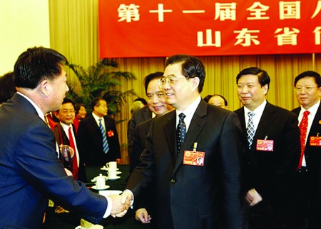 2008年3月9日,胡锦涛总书记参加十一届全国人大一次会议山东代表团审议。图为胡锦涛总书记向李登海代表询问玉米育种情况。(资料片)