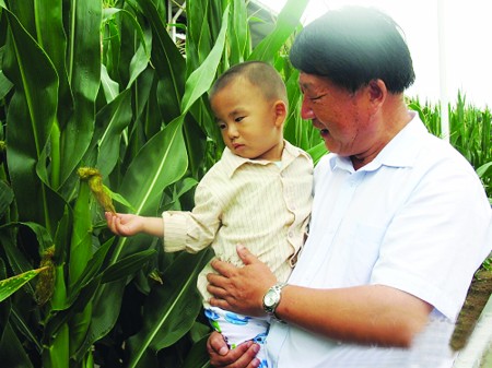 眼前的玉米和怀里抱的孙子,是如今已经60岁的李登海的两件“宝贝”。(资料片)