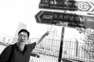日前,记者随安建军委员来到三元桥地铁站,自朝北开设的C2出口走出地面,扭头即可看到一块蓝色的指示标牌,上面的箭头指向南面,写有“公交车站”的字样,并标注着550米的距离。