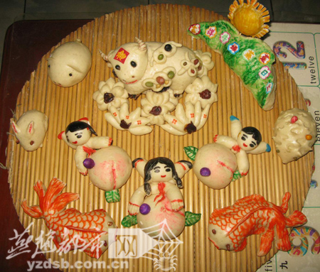 黄牛前方是三个寿桃的造型,象征着牛城美丽舒适的城市环境。寿桃旁是少先队员和辅导员教师,少先队员张开双臂,脸上现出欢喜的神情,这预示着新一代接班人团结向上、健康成长,也显示了祖国繁荣昌盛、人民丰衣足食。“少队员的身上造型是桃子,上面是李子,有暗含桃李满天下的意思。”叶青告诉记者,为了制作面塑,她还请教了老人,精选集中造型,既有传统的体现也有现代元素的渗透。陈志强/摄