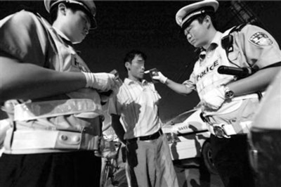 朝阳交警对一名司机进行酒精测试 京华时报供图
