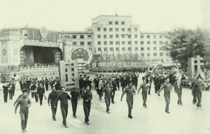 兰州理工大学的孙勤老先生为我们带来了两张记录着1962年兰州市国庆节庆祝盛况的照片,留下了几十年前人们庆祝的笑脸。1962年,为迎接国庆13周年,当时甘肃工业大学(后改名为兰州理工大学)管弦仪仗队的师生从百货公司借来统一服装,排练了很久后,10月1日来到兰州饭店门前,参加国庆13周年庆典。照片上,管弦队的师生们吹奏着乐曲走在专门搭建的主席台前,身后是学生方队和巨大的国徽,方队中的很多女学生梳着上世纪60年代流行的长至腰间的麻花辫。