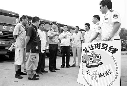 昨天上午,槐荫区交警大队的民警来到区环卫渣土运输车队,这是全市首支具有官方背景的渣土运输车队,也是我市规范建筑渣土运输市场的试点车队,旨在引导其他运输队伍规范发展。“司机开车运输渣土时,特别是晚上开车,要严格按照指定线路、指定时间、指定倾倒点、篷盖运输。”尚健给渣土车司机上起了交通安全课,“开车要做到不超载、不超速、不撒漏、不带泥上路、不乱鸣笛,行至斑马线要主动减速慢行,遇有行人通过斑马线时停车让行,确认安全后再通过。”