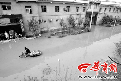 这条位于三桥街道办闫石村所属的工业区内、宽不过七八米的水泥路顺着西宝疏导路高高的路基向西延伸,越往西地势越低。导致路面长期积水的罪魁祸首是:500多米路面上找不到一个下水井口,高处流下的雨水根本排不出去。路两侧至少有12家小型加工企业天天“开门见水”,300多工人每天蹚水,有的厂干脆买了人力三轮车,拉上下班的工人“过河”。“水路”边一家风机生产厂的七八个年轻人蹲在厂门口半米多高的沙袋上,工人们说,厂子已停产好几个月了,运送原料的小货车进来就熄火。这家厂门口的积水至少60厘米以上,“就算不下雨,沙袋也不会搬走,平时积水最浅也有20多厘米。”“最西头那家修理厂今年初搬过来,干了三四个月就走了。”与风机厂相距几十米的西安科弘厨房工程设备有限公司负责人鲜祖洪说,自己这几天正在找地方准备搬走,“一下雨,水就淹到厂里,每家厂门口都挡着沙袋,厂里备着水泵,一开门就闻着恶臭,厂区办公楼也出现了塌陷,我实在是忍受不了了。”