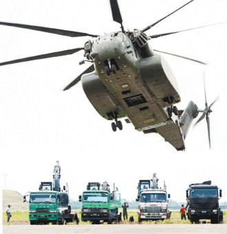 美军MH-53E型“种马”直升机,该机机底有专用绞盘,可以吊挂重型机具进入山区救灾。台湾《联合报》