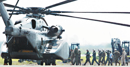 美方驰援台湾“88水灾”的MH-53E型“种马”直升机昨天飞抵台军的台南军用机场。台湾《联合报》