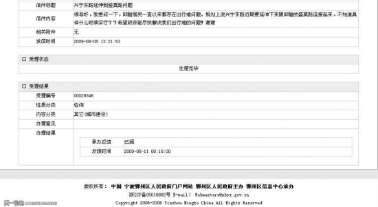 宁波网友“天生我才2”不久前向区长信箱反映邱隘居民出行难问题,过了6天,等来网上回复,就两个字:“已阅”。