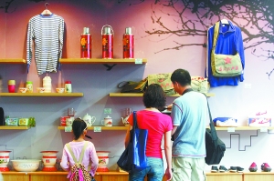 展厅结尾处,正在布置的纪念品销售现场,做旧的老铁皮糖盒、海魂衫、回力鞋等数十件已经淡出历史舞台的老物件重新登场,吸引了不少观众询价购买。