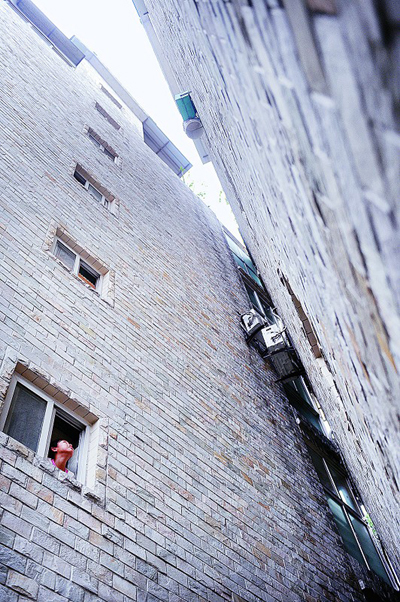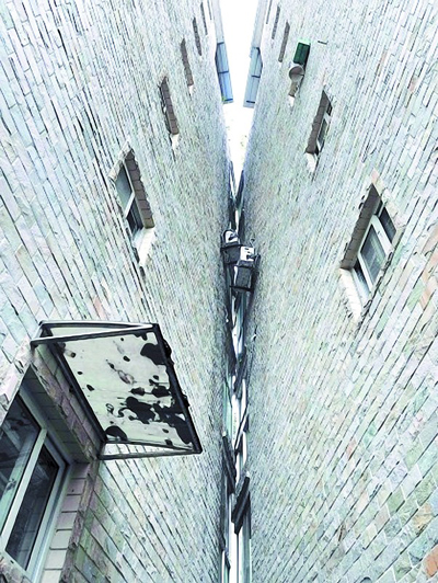 再抬头向上看,张先生发现6栋和7栋两栋楼越向上贴得越近,交房不到5年的楼居然倾斜了。后来张先生才知道,6栋、7栋相邻的墙壁已经呈20度夹角。在小区设计图上,两楼间最窄距离为6厘米。现在,这个距离已经不存在。