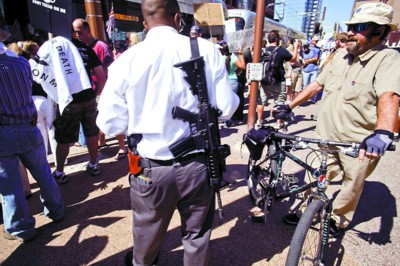 奥巴马17日在亚利桑那州菲尼克斯演讲时,一群人在演讲会场外示威,其中十几个示威者公然携带枪支,一人甚至肩挎“AR-15”半自动步枪。