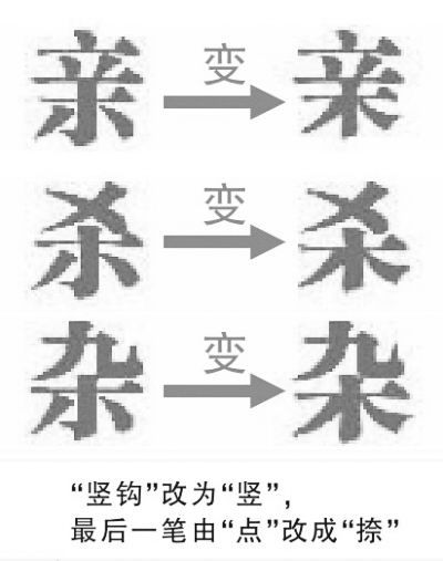 此次公布的44个汉字的调整包括“琴”字上左部最后一笔横变提,“衾、汆”等字下部件末笔捺变点,“亲、杀”等字下部件的竖钩变竖,“唇、蜃”等字由半包围结构改为上下结构等。具体是: