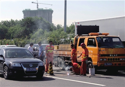司机王先生说,昨天早上他开车行至四元桥附近时,发现南向北主路车行缓慢。车内广播称附近道路有钢板翘起,造成早高峰拥堵,一直堵到四惠。随后他看到四元桥主路南向北方向内侧第二条车道上有钢板翘起,行经此处的车辆纷纷绕行。7点左右,交警赶到现场,将事发车道围起,并开始疏导交通。