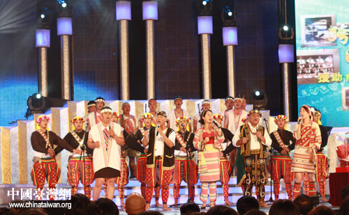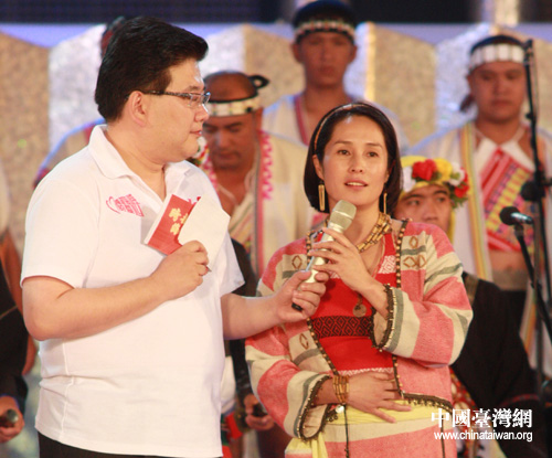 因主演李安导演的电影《喜宴》而被内地观众熟知的高金素梅和台湾少数民族代表,身着民族服装来到节目现场,她说:“看到这么多朋友的帮助,我们很感动,有你们在,我们不会孤单!”(中国台湾网 高斯斯 摄)