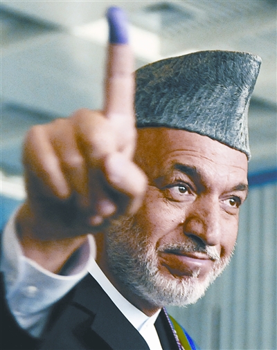 卡尔扎伊投票后展示手指上的墨迹
