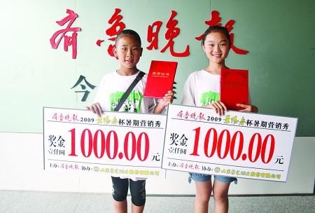 20日,齐鲁晚报2009“景阳春杯”暑期营销秀第二期举行颁奖仪式,获得金奖的两名选手,分别为首次参加营销秀的李昊原(右)和第二次参加营销秀的谭新敏(左),两人分别获得1000元的获胜奖金。2009暑期营销秀活动圆满落幕。