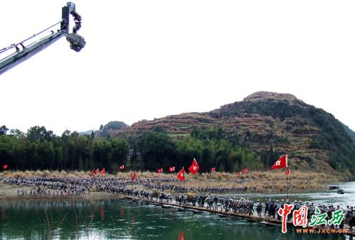 拍摄影师高空拍摄。影片在修水主要拍摄方志敏领导的红十军为支援时的渡河场景以及方志敏在指挥所指挥战斗的场景,是影片中最重要、最大的战斗场景,有3000多演员参加。江西网资料图片。(余昌清 摄)