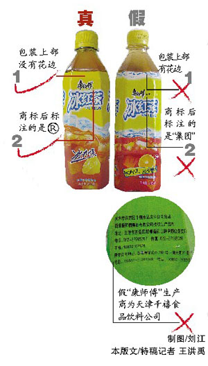 粗看瓶身,这瓶冰红茶与真正的康师傅冰红茶一样,再仔细辨别,破绽就露了出来:瓶身上打印的生产厂家,是位于天津市西青区的一家名叫“千禧”的饮料厂,并且在注册商标“康师傅”的后面,还多了“集团”两个字。