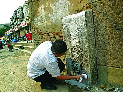21日下午,记者采访途经茂新街东首时,天桥区文化局的几位工作人员正围在路北的一栋平房前,只见其中一名工作人员将水均匀地刷在嵌进墙里的一块石头上,随后又在石头上铺上一张宣纸,紧接着用一个蘸着墨汁的布包轻轻地拍打纸面。几分钟过后,“第四厂”几个繁体大字清晰地出现在宣纸的下端。