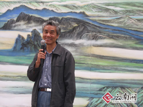 昨天上午,著名军旅画家钟开天为北京人民大会堂金色大厅创作的大型壁画《壮丽中华》晋京观摩座谈会在昆明召开,作品长18米,宽3.72米,表现了万里江山的主题,是画家为祖国诞辰60周年献上的一份厚礼。
