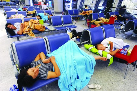 上图:8月23日凌晨,旅客在青岛机场候机厅长椅上休息。