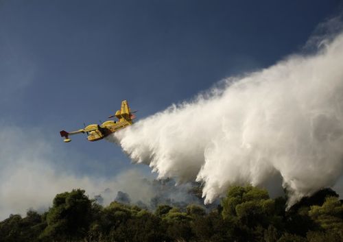 希腊首都雅典北部的新马克里,一架消防飞机从空中洒水灭火。图片来源:新华社/美联