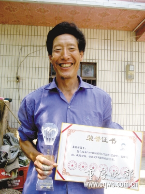 谁也想不到,这个天天抹水泥、年过半百的泥水匠,竟走进央视“星光大道”演播厅,在“歌颂祖国.全国艺术人才大赛”中获得金奖。