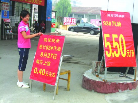 本报8月 26日讯 最近一段时间,关于油价上涨的传闻不断。26日,记者走访了市区多家加油站发现,油价上调的“前兆”越来越明显,甚至有加油站挂出了“预计93号汽油8月 27 日每升上涨0.4元左右”的标识牌。但中石化属下加油站表示,暂时未接到油价上涨的通知。