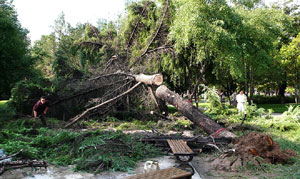 昨日8时30分,省会儿童公园内,一阵阵“哗哗”的电锯声打破了往日的寂静。原来在公园北门不远处,一棵生长了几十年的雪松被前日的狂风暴雨连根拔起,倒在地上。两名工人正在对树木进行砍伐。
