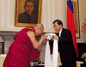 2001年4月5日,达赖访问台湾,时任台湾地区领导人的陈水扁两度会见了他