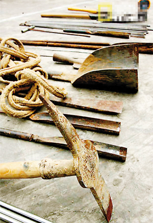 从陕西韩城大墓盗墓者手中缴获的盗墓工具,包括铁锨、绳索和大小不等的洛阳铲。