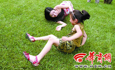 海容天天8月19日来到大唐芙蓉园,和一名小孩很快混熟了,俩人打成一片,她也露出少见的爽朗笑容