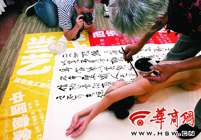 不一会儿,只裹着浴巾的海容天天缓步走进房间,所有人的目光随着她来到已铺设好的宣纸上,又看着她缓缓躺下,海容天天除去浴巾全身赤裸,蜷起身子侧倒着。这时,李文诚起身,一手捧着装有墨汁的碗,一手执笔走过来,开始在宣纸上挥毫“道可道,非常道……”,整个过程流畅,在海容天天身上留下了一道道墨笔。40分钟后,一张纸写完了,海容天天走进浴室,将身上的墨迹清洗干净后再次回到房间,躺在已换好的宣纸上,李文诚又继续进行书写。在写完两张纸后,海容天天没有立即洗去墨迹,而是闭目端坐在地上,刘振川持琴上前紧坐在海容天天对面,两人合作表演名为《心琴》的行为艺术,悠扬的琴声顿时在房间内回响,书法、琴声令人的思想在那一瞬间恍若回到古代,忘了赤身的海容天天……一位观者禁不住感叹:“这真是一幅美好图画!”曲终,人们的思绪又马上回到现场,李文诚又开始了书写……