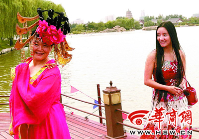 8月19日,海容天天在大唐芙蓉园,对一名着唐装的游客产生兴趣。她认为生活就是在表演,只是方式不同