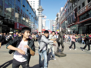 几个衣着时尚的年轻人将一个将近2米高、蒙着黑布的东西用滑轮车推进了步行街。快节奏的音乐响起,黑布被扯下,卷发扎起、戴着墨镜、翘臀屈腿的迈克尔·杰克逊塑像以招牌式的姿势,出现在市民面前。