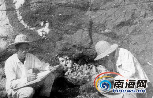 两个戴草帽的工作人员,在烈日下面对一堆裸露的水晶块,神情专注地素描。这是海南地矿局资料室里一张发黄的照片。照片拍摄时间是1955年11月份,拍摄地点是海南岛中部一个低矮的山丘:羊角岭。