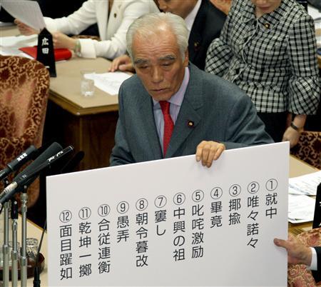 最让麻生出糗的状况发生在今年1月20日日本参议员预算委员会的一次会议上,民主党副代表石井一出人意料地举起了一张写有12个汉字词组的纸板向麻生发出突然袭击,要求他读出这些汉字的正确读音。尴尬的麻生不敢接招,只露出一脸苦笑。