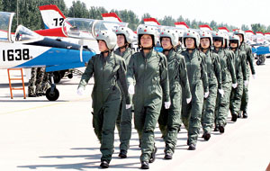 8月30日,备受关注的中国空军首批歼击机女飞行员,在华北某机场身着具有高科技含量、为她们量身定做的新型飞行装具,一展巾帼英姿。
