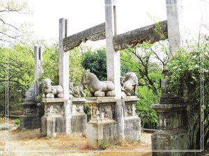 探访李光炳夫妇墓的第一个站便是这个十分壮观的墓前“享堂”,而循着“享堂”侧面的山路,就可以达到坟墓的第二个雄伟建筑——石雕门牌坊。4个厚实的石基座立起石柱,中间两个基座的前后墩上分别有两个石狮和两个石象,这些基座侧面都分别雕刻了麒麟等象征吉祥的动物。门牌坊被石柱分成了两道侧面的小门和中间的正门,正门外侧的石基上是前脚直立后脚端坐的石狮,石头微微偏向门内,而内侧石基上的两头石象成四肢跪地状。如果说石狮具有传统中国雄伟特色的话,那么石象则颇有几分西方色彩,就连耳朵都成了多边的花叶形,看上去给人一种谦恭的模样。
