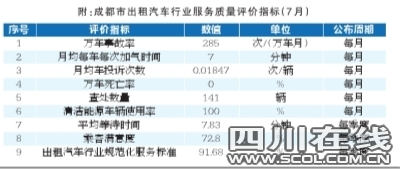 7月,成都出租车平均等待时间7.83分钟,乘客满意度72.8%……昨日,成都市交委首次发布成都市出租车行业服务质量9项评价指标,这也是国内首次发布交通行业评价指标。
