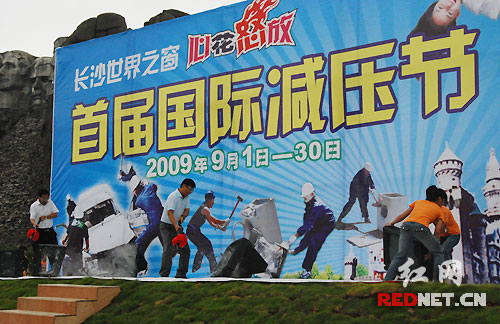 主题为“心花怒放”的长沙世界之窗首届国际减压节,精心设计了“减压三部曲”:即“电视砸砸团”、“私密减压房”、“疯狂尖叫帮”三个环节。其中,“电视砸砸团”可以说是最“奢侈”却最有震撼效果的减压方式之一:在活动期间,在世界之窗的滑草场,每天都会有数十名身穿统一的战衣、头盔、护目镜、手套的游客,手持大锤,在主持人一声令下之后,疯狂的打砸摆放在场地内的汽车、摩托车、电视机等废旧设备,最大程度的发泄自己心中的压力。据了解,目前只有西班牙曾经举办过此类型的减压活动。