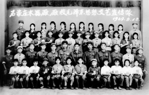 据张利民介绍,这张老照片是石市原大经路小学文艺宣传队的合影,拍摄于1969年8月19日。当时,文艺宣传队由郭俊卿老师负责,宣传队最大的亮点就是拥有自己的小乐队,因此他们经常参加到厂矿、部队、学校的慰问演出,深受群众的欢迎。当年的宣传队中有49名队员,张利民是小乐队的队长。1969年暑假,由于张利民等同学就要升入中学,在郭老师的提议下,大家拍下了这张合影。