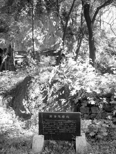 2009年8月13日上午,记者从洪谷山谢公渠首入口,顺洪谷河西行l公里,抵达荆浩隐居处。荆浩隐居处已无遗迹,只有一块石碑简单书写“荆浩隐居处”。