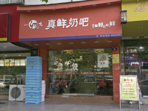一个居住区域内出现三种版本门店并存的现象始于今年。今年年初开始,部分一鸣真鲜奶吧将传统的橘红色为主色调的门店更新成了白加黑的奶牛图案,就在奶牛图案的一鸣真鲜奶吧出现不久,今年5月份起一些门店又悄悄更新成了黄色调的欧式门面。