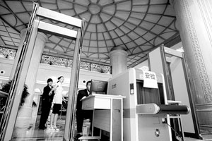 走进新闻大厦酒店大堂,首先要通过两扇安检门、将随身携带的包送进安检仪接受检查,再接受安检人员的金属探测器的“扫描”后才可以进入酒店内。