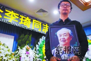 10时许,李琦先生的女婿手捧着遗像来到灵堂,遗像上的先生微笑着,据说这是他10年前出游时拍下的。“在我的眼里,先生就是这么一位有亲和力的老师,虽然在学习上他对我们要求很严!”看着遗像,他的学生吴冠群有感而发,一大早冒雨从方庄赶到这里,他的鞋早已湿透了。