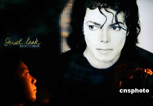 2009年7月6日,一个小孩在放映迈克尔·杰克逊的图像前缅怀。据悉,迈克尔·杰克逊葬礼将被安排在当地时间7日举行,地点是在洛杉矶斯台普斯中心。 中新社发 井韦 摄