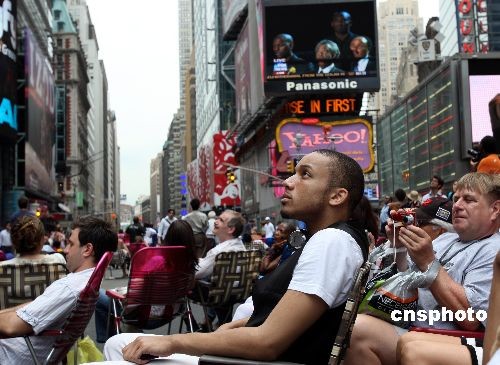 7月7日下午的纽约时代广场,多个大屏幕电视都在直播在洛杉矶斯台普斯中心举行的迈克尔.杰克逊公众追悼会,引来许多路人观望驻足。 中新社发 孙宇挺 摄